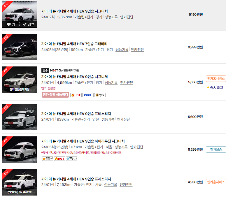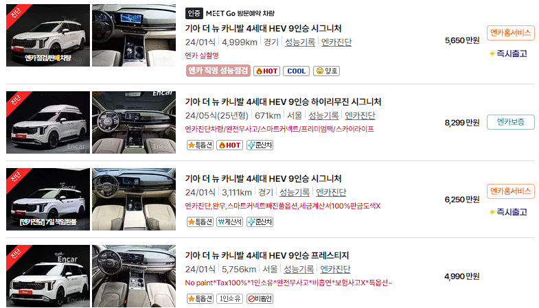 특히, 준신차급이 아닌 완전 신차급 카니발 하이브리드는 약간의 프리미엄이 발생하고 있는 상황입니다.