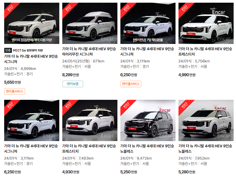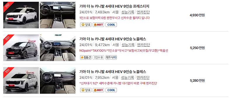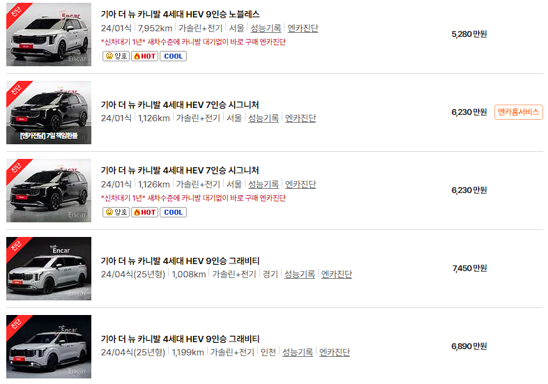 특히, 준신차급이 아닌 완전 신차급 카니발 하이브리드는 약간의 프리미엄이 발생하고 있는 상황입니다.