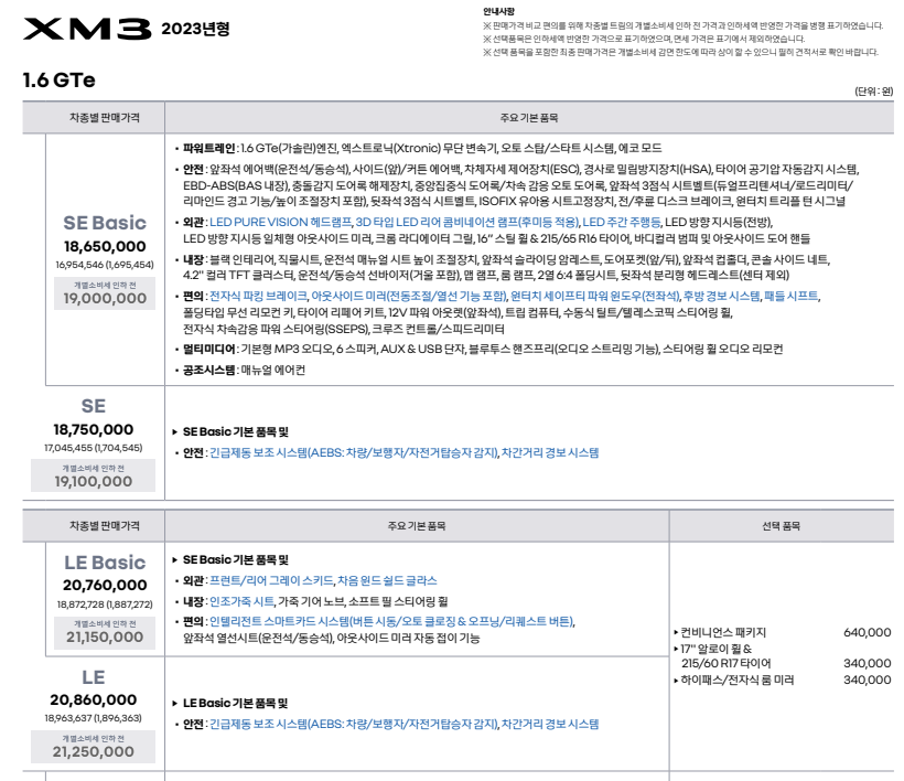 xm3 1.6 GTe 엔진은 다섯 가지 트림으로 구성되어 있으며 1천만 원 후반부터 2천만 원 초반의 가격이 책정되었습니다.