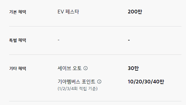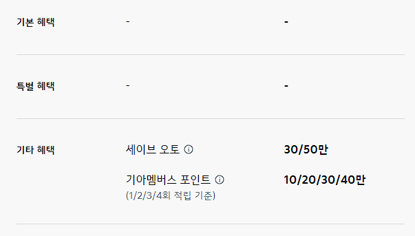 세이브 오토 20만 원, 기아 멤버스 포인트 최대 20만 포인트 적립은 기타 혜택으로 제공됩니다.