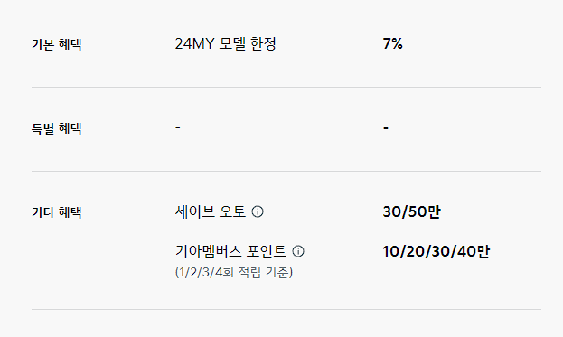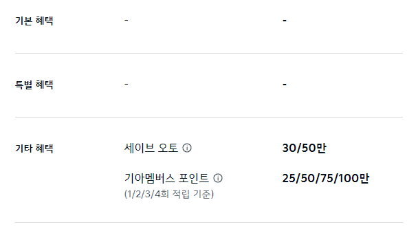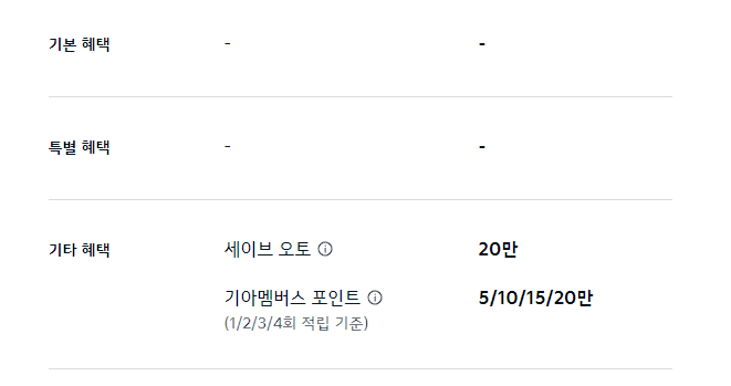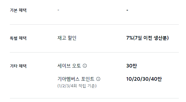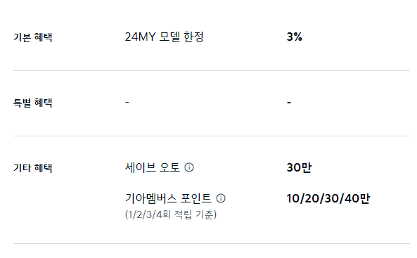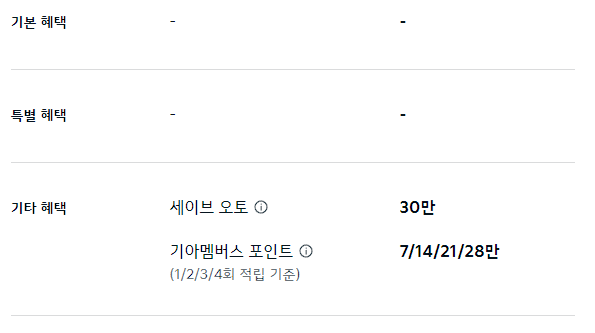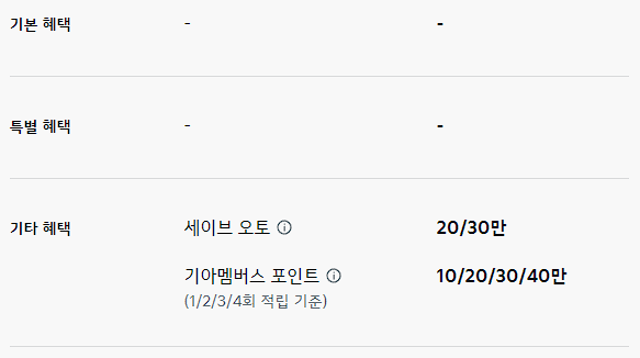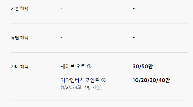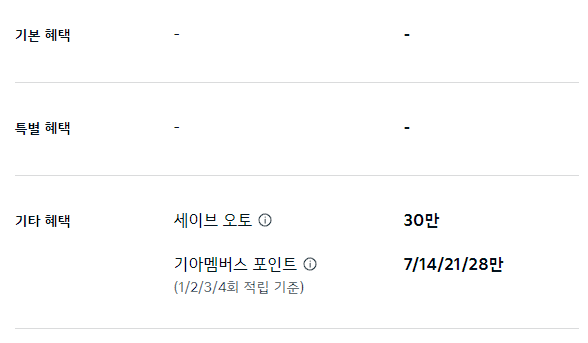 세이브 오토 20만 원, 기아 멤버스 포인트 최대 20만 포인트 적립은 기타 혜택으로 제공됩니다.