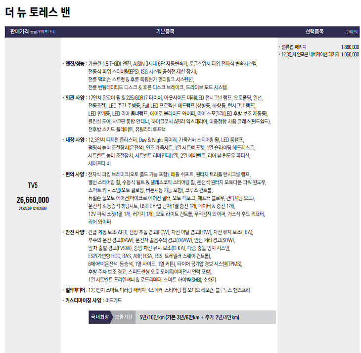 상위 트림 tv7 트림도 3천만 원에 풀옵션 suv 밴 차량 옵션을 제공하고 있습니다.
