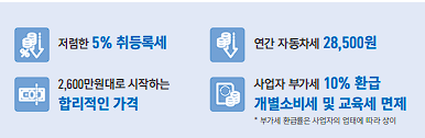토레스 밴은 사업자가 구매 시 부가세 10% 환급됩니다. 또한, 개별 소비세와 교육세가 면제됩니다.