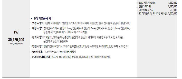 상위 트림 tv7 트림도 3천만 원에 풀옵션 suv 밴 차량 옵션을 제공하고 있습니다.