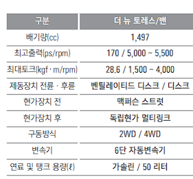 6단 자동 변속기와 1,497cc 배기량을 특징으로 하며 최고 출력은 170마력입니다.