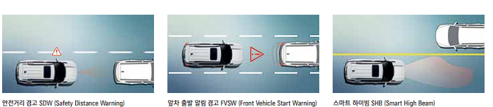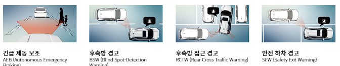 긴급제동보조, 후측방 경고 장치, 안전 하차 경고 시스템 등의 기능이 적용되고 있습니다.