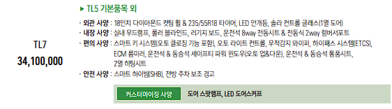 토레스 하이브리드 상위 트림은 TL7 차량으로 3백만원 가량 비쌉니다.