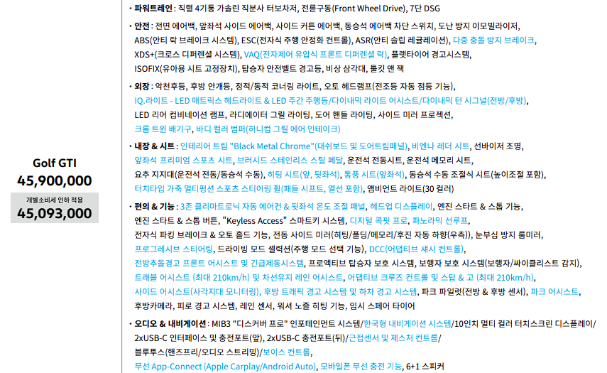폭스바겐 골프 가격과 구성품목을 살펴보겠습니다.
