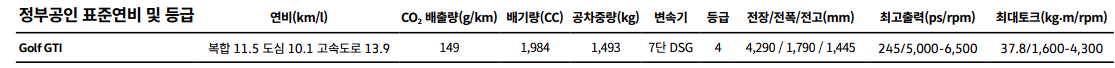 폭스바겐 골프 GTI는 11.5km/l의 복합연비를 달성하였습니다.