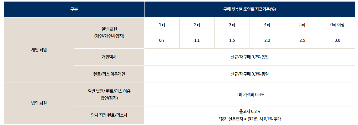 상기 적립률은 고객이 차종 구매 시 지급한 최종 가격 기준이며, 대당 최대 적립액은 최대 200만 포인트입니다. (원단위 소수점 절사)