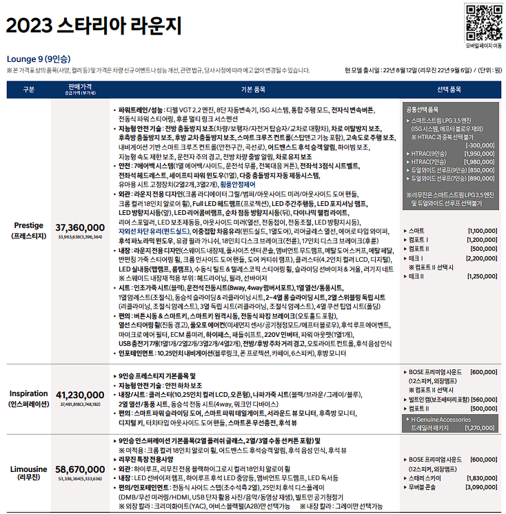 스타리아 라운지는 프레스티지, 인스퍼레이션, 리무진 트림으로 구분되어 판매 중입니다.