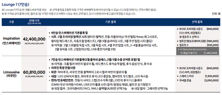 스타리아 라운지 리무진은 인스퍼레이션보다도 약 2천만 원가량 비쌉니다.
