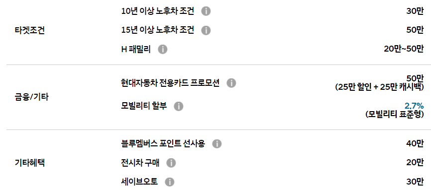 h 패밀리 혜택으로 현대자동차 재구매 횟수에 따라서 최대 50만 원 할인이 제공됩니다.