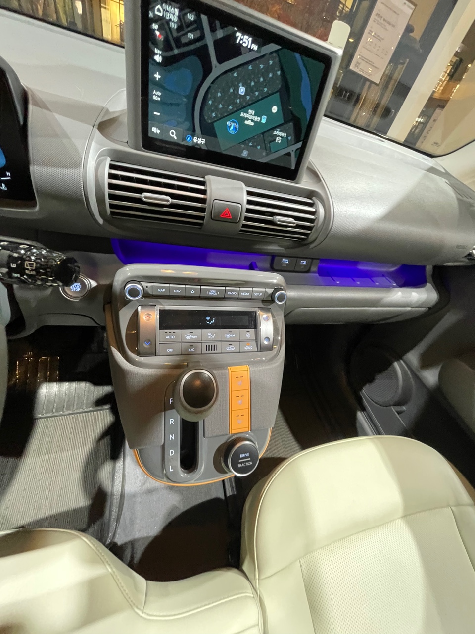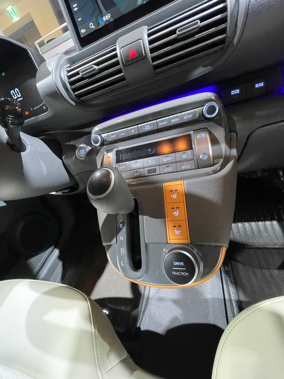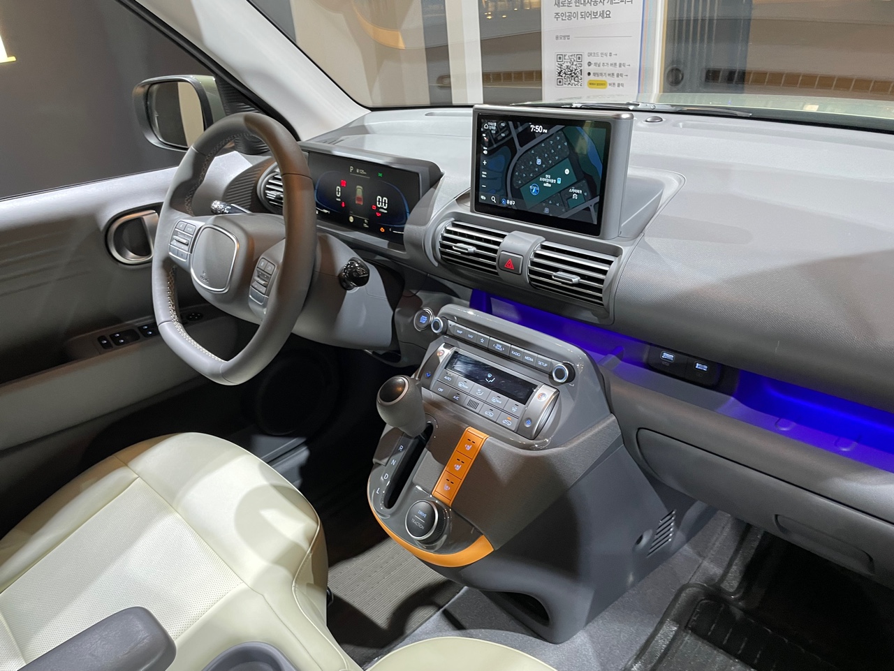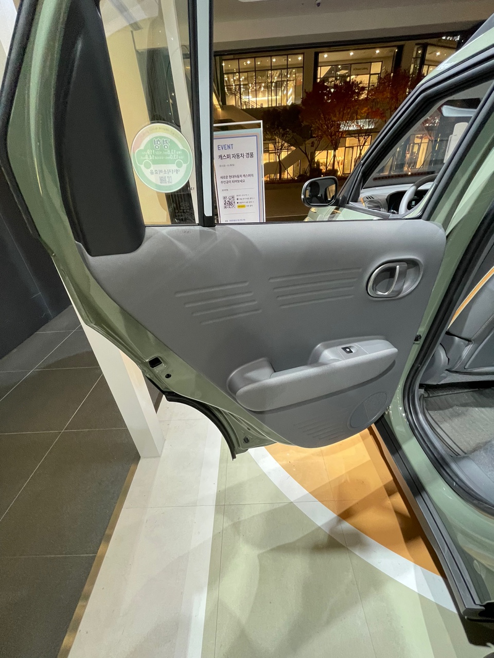 하지만, 센터패시아 마감 재질에 대해서는 다소 아쉬움이 남습니다. 전시차는 분명 상위 트림의 풀옵션 모델입니다. 그럼에도 저렴한 플라스틱 재질의 자재를 활용하였습니다. 경차임에도 적지 않은 가격 캐스퍼 실내가 싼마이 느낌이 나서 아쉬운 부분이 있습니다.