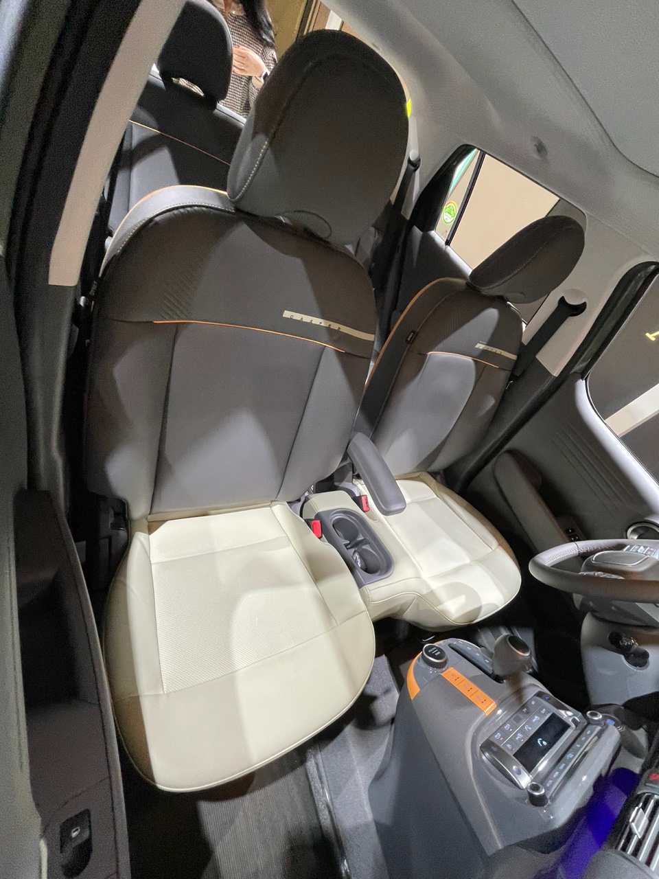 앞좌석은 뒷좌석에 비하여 조금 여유로운 공간이 있습니다. 컵홀더 2개가 운전석 옆에 자리 잡고 있습니다. 그 위쪽으로는 팔걸이가 존재하며, 콘솔박스는 따로 있지 않습니다.