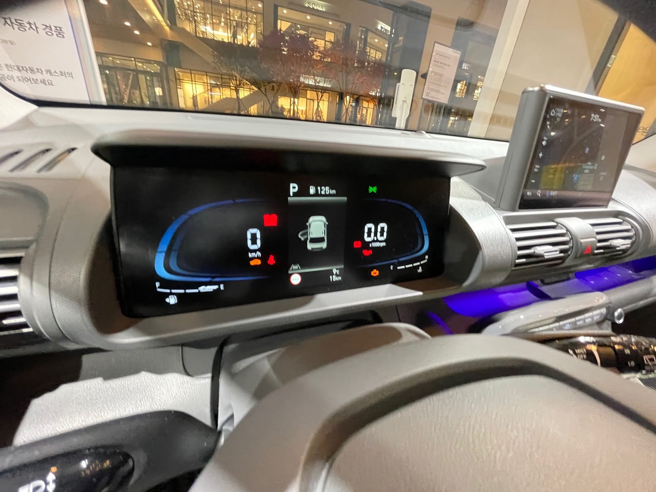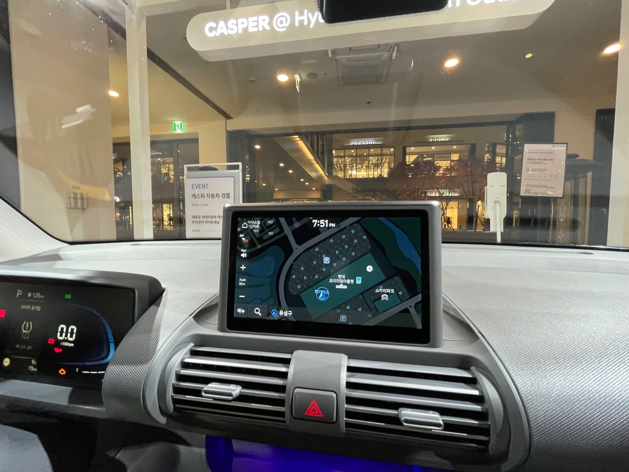 캐스퍼 앞좌석에 앉아 바라본 모습입니다. 가장 눈에 띄는 점은 계기판이 컬러 lcd 계기판이 적용된 부분입니다. 경차임에도 화려한 lcd 계기판이 적용되어 미래지향적인 모습입니다.