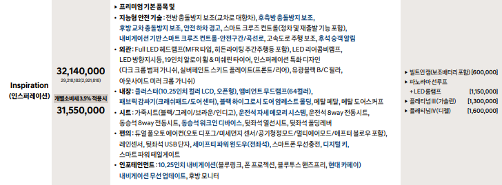 최고 트림인 투싼 인스퍼레이션은 특별한 옵션을 추가하지 않더라도 크게 부족함 없이 대부분의 편의사양이 기본 적용되었습니다.