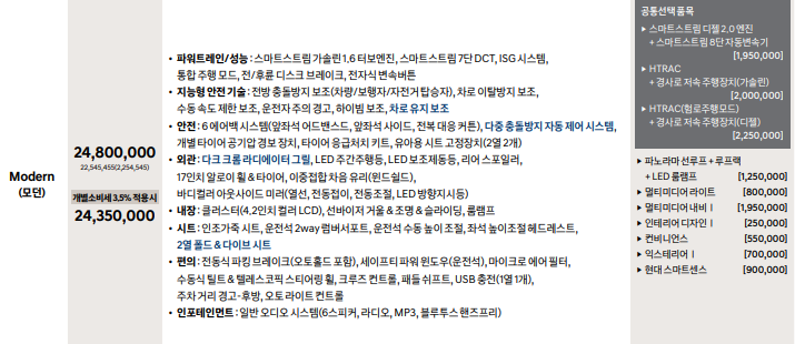 낮은 트림인 투싼 모던은 옵션이 부족하긴 하지만, 상대적으로 저렴한 가격으로 경제적인 모델입니다.