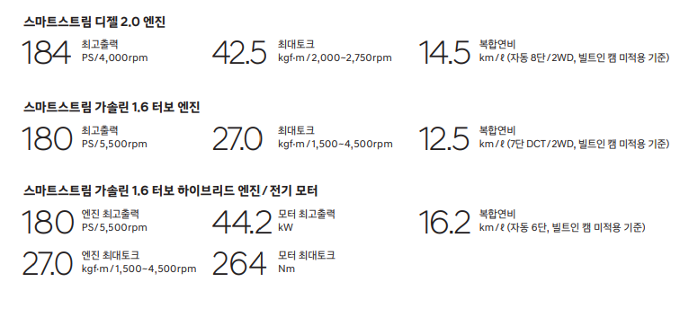 투싼 하이브리드 모델의 제원은 다음과 같습니다.