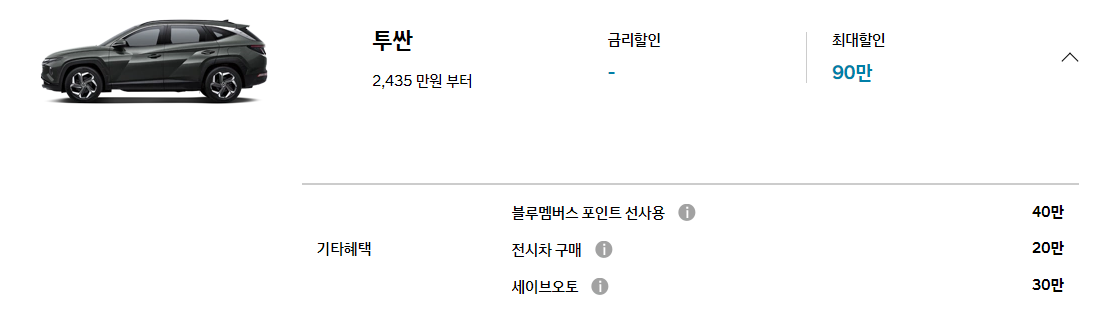 투싼의 경우도 최근 신차를 출시한 만큼 기본적인 포인트나 전시차 할인 외 추가 할인 혜택을 제공하고 있지 않습니다.