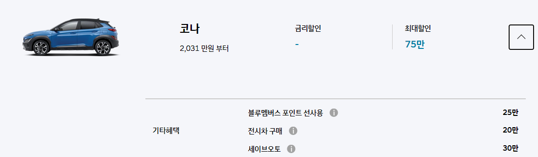 코나도 베뉴와 마찬가지로 이번 달에는 특별한 할인 혜택이 없습니다.