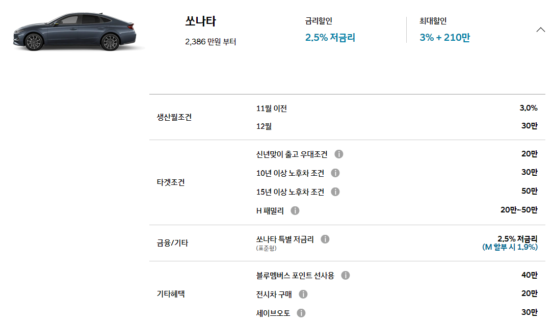 쏘나타는 할인 혜택이 큰 편입니다.