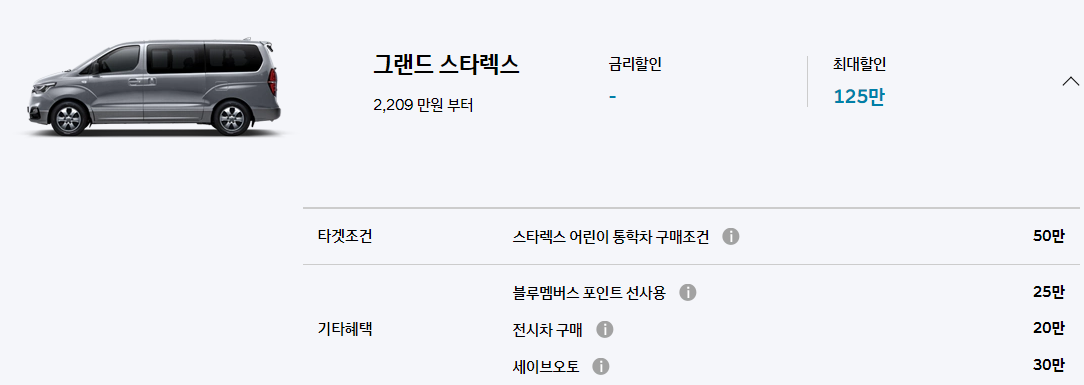그랜드 스타렉스는 어린이 통학차량으로 구매 시 50만 원의 할인을 제공합니다.
