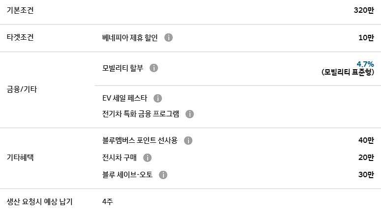 현대차 전기차의 구매 혜택도 다양합니다. 기본적으로 320만 원 차량 가격을 할인하며, 모빌리티 할부나 ev 세일 페스타를 통해서 추가 할인이 가능합니다.