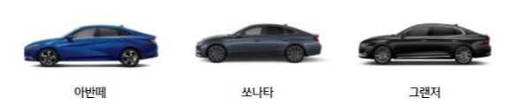현대자동차의 승용 부분에는 아반떼, 소나타, 그랜져가 존재합니다.