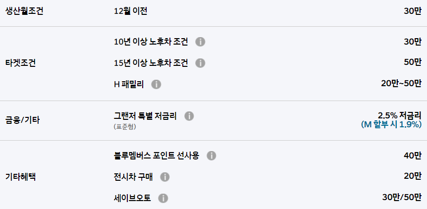 또한 노후차량 보유 조건에 따라 15년 이상 노후차의 경우 최대 50만원 할인도 제공합니다.