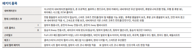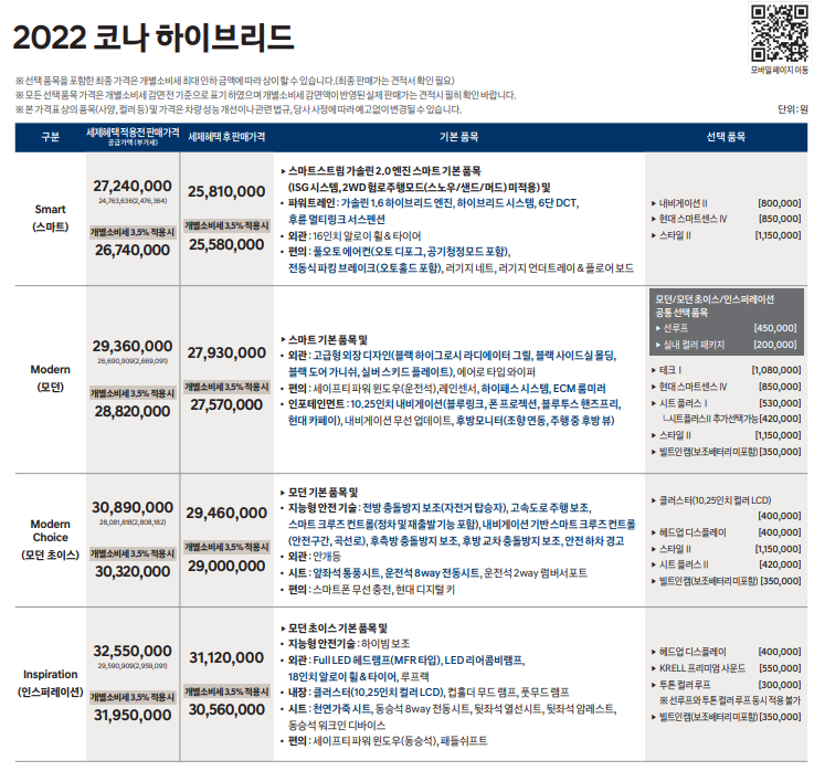 코나 하이브리드와 가솔린 모델 가격표는 다음과 같습니다.