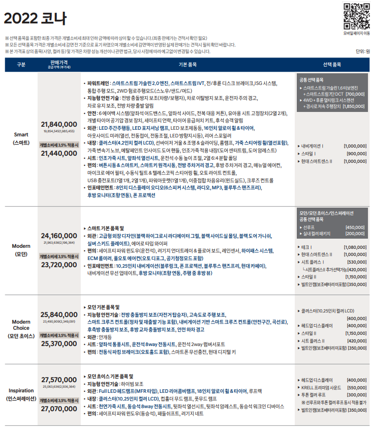 2022 코나 가격은 다소 인상되었습니다. 트림별 가격은 다음과 같습니다.