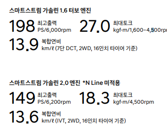 코나 2.0 엔진은 1.6 터보 엔진에 비하여 다소 낮은 출력과 연비를 보여줍니다. 코나 1.6 모델의 상품 경쟁력이 더 높을 것으로 생각됩니다.
