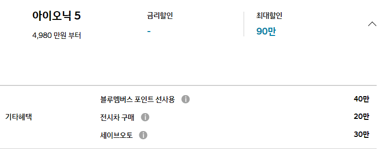 아이오닉 5의 경우도 최근 출시로 추가 할인이 존재하지 않습니다.