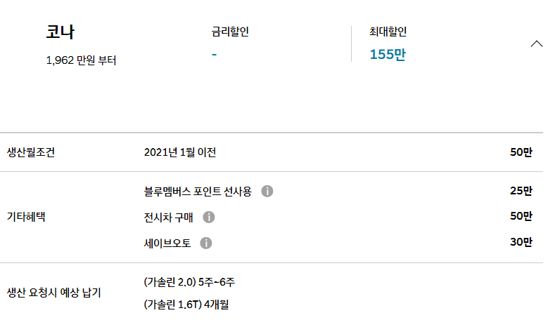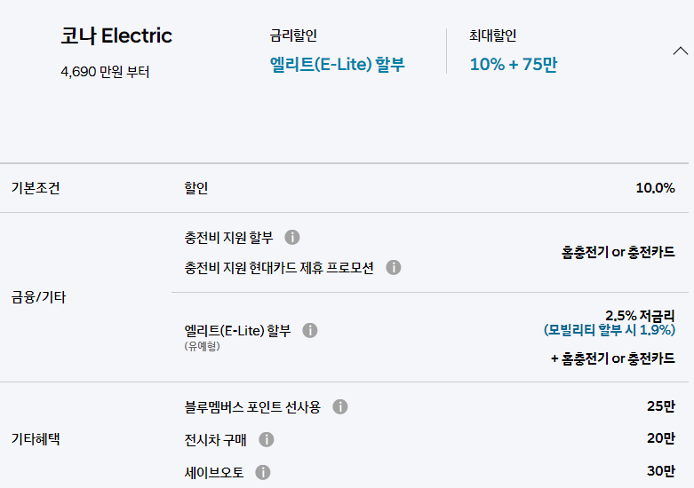 코나 일렉트릭, 전기차의 경우 기본 10% 할인을 보여줍니다.
