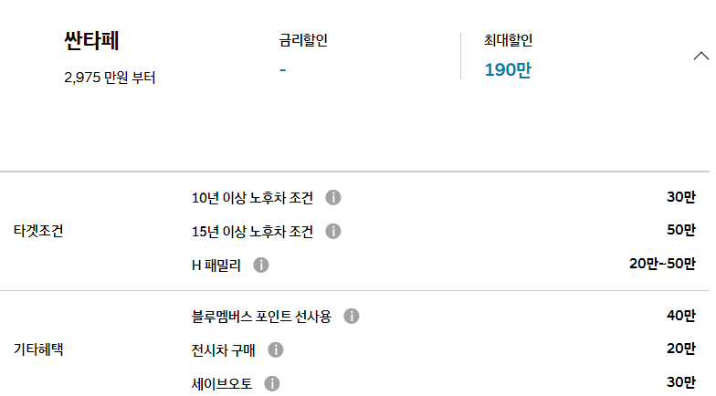 싼타페는 10년 이상 노후차 보유 고객에게 최대 50만 원의 할인을 제공합니다.