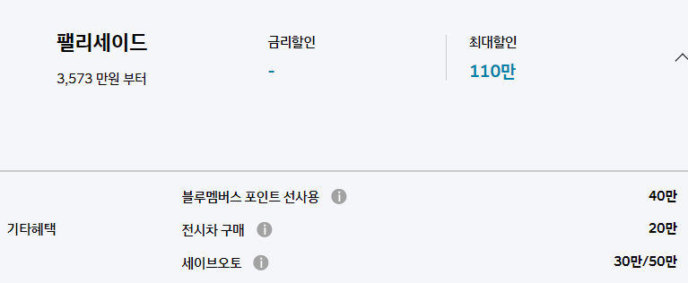 팰리세이드도 큰 인기로 주문이 밀려있기에 특별한 할인이 존재하지 않습니다.