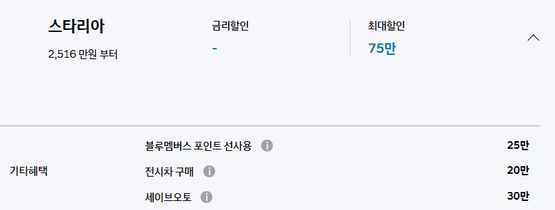 스타리아의 경우 최근 출시로 특별한 할인이 존재하지 않습니다.