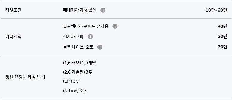 아반떼 구매 고객은 베니피아 제휴 할인, 운전결심 캐피백 할인, 블루멤버스 포인트 선사용, 전시차 구매, 블루세이브-오토 등의 할인 혜택을 받을 수 있습니다.