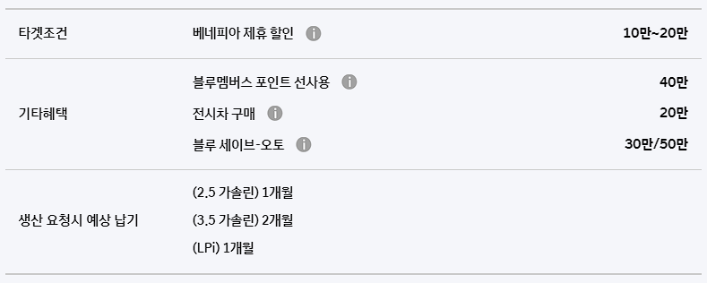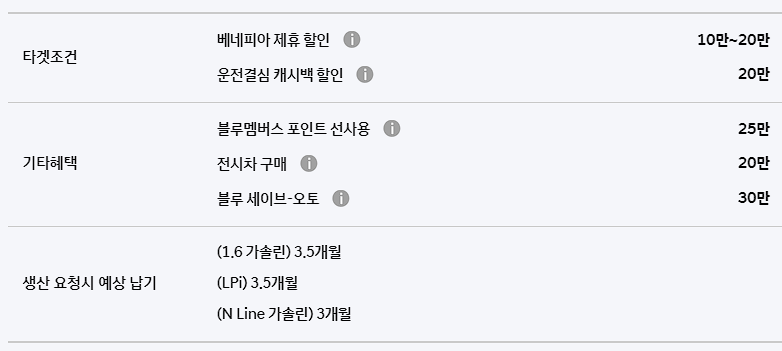 베네피아 제휴 할인은 베네피아 포인트 전환 고객이 차량을 출고 시 적용이 가능합니다. 기본 10만 원의 할인이 제공하며, 전기차를 출고하게 되면 10만 원이 포인트가 추가로 지급됩니다.