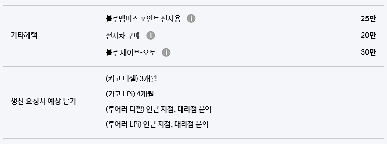 스타리아 할인 혜택은 미미합니다. 블루멤버스포인트, 전시차 구매, 블루세이브 오토 등의 할인 혜택을 최대 30만 원까지 받을 수 있습니다.