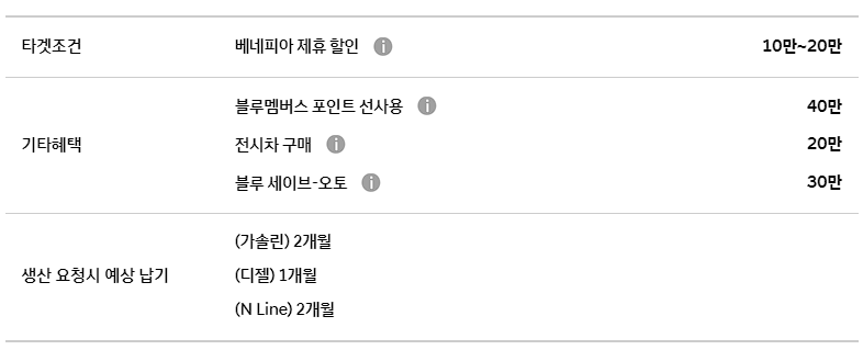 베네피아 제휴 할인은 베네피아 포인트 전환 고객이 차량을 출고 시 적용이 가능합니다. 기본 10만 원의 할인이 제공하며, 전기차를 출고하게 되면 10만 원이 포인트가 추가로 지급됩니다.