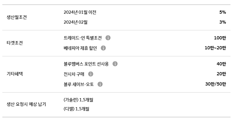 2024년 1월 이전 생산된 차량에 대해 차량가액 5%에 대해 할인 혜택을 받을 수 있습니다. 2024년 2월 생산 차량도 3%의 할인 혜택이 가능합니다.