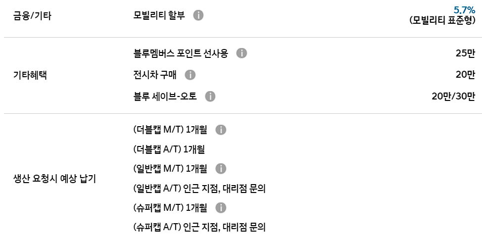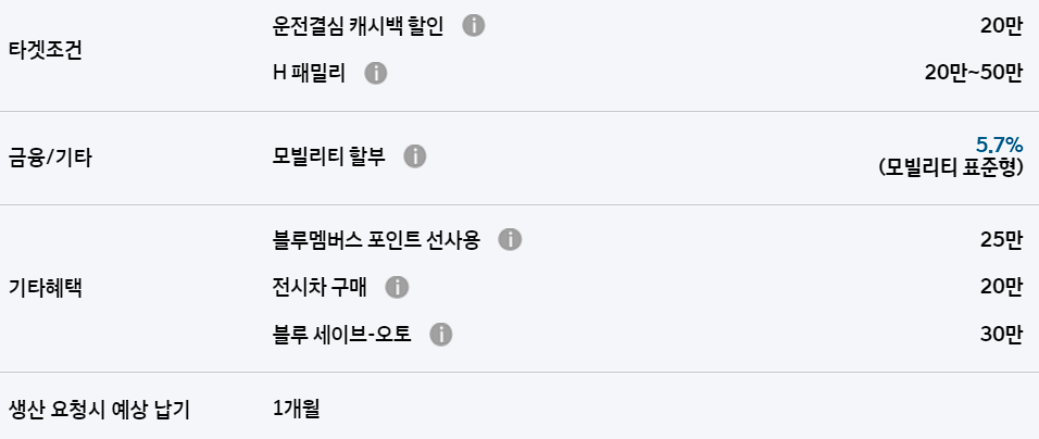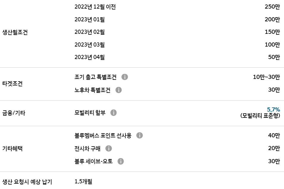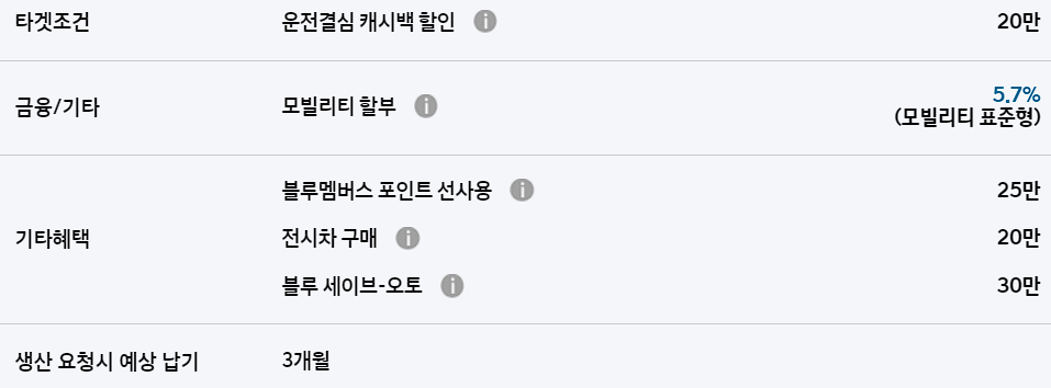 이외에도 모빌리티 할부, 블루멤버스 포인트 선사용, 전시차 구매 할인 혜택을 통해서도 추가 할인 혜택이 제공됩니다.