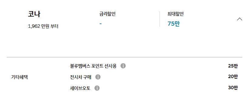 코나의 경우 베뉴와 마찬가지로 기타 혜택( 블루멤버스, 전시차 구매, 세이브 오토) 이외에는 기본 할인이 존재하지 않습니다.