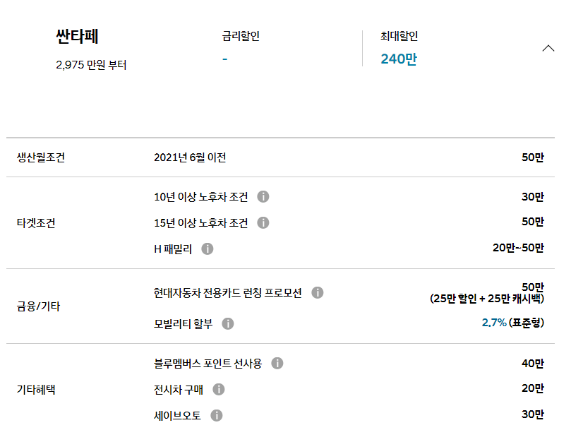 싼타페 7월 프로모션, 할인조건은 6월 이전 생산 재고차량에 50만 원이 제공됩니다.