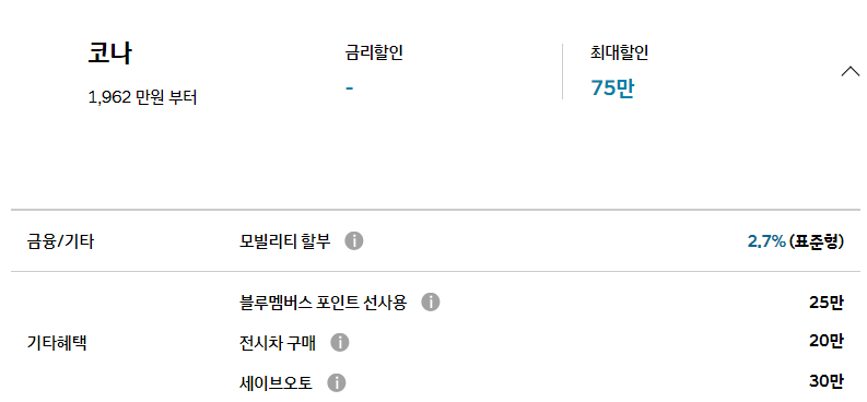 코나의 경우도 베뉴와 마찬가지로 특별한 공통 할인이 존재하지 않습니다.