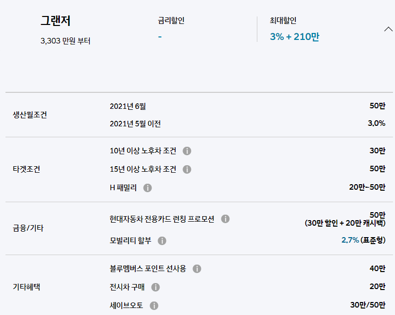 2021. 7월 그랜저 판매조건, 프로모션은 재고차에 대하여 최대 3% 할인을 보여 줍니다.