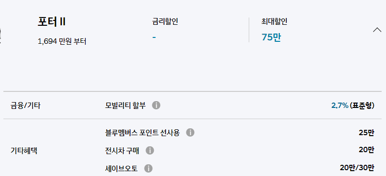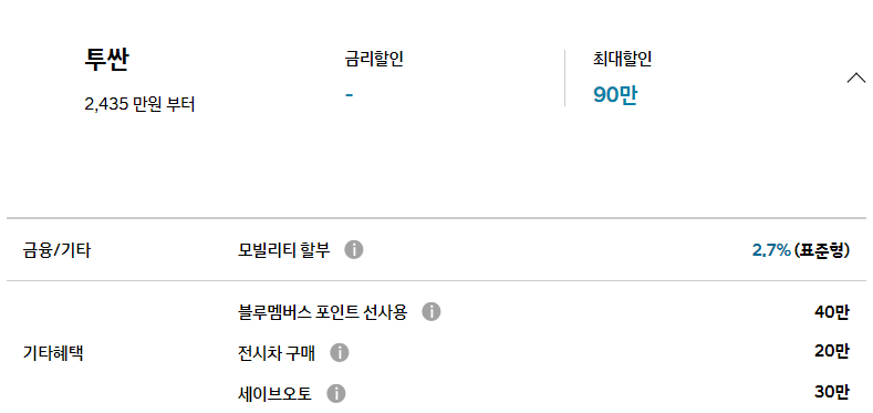 모빌리티 할부, 전시차 구매, 블루멤버스 포인트 등의 할인이 존재하네요