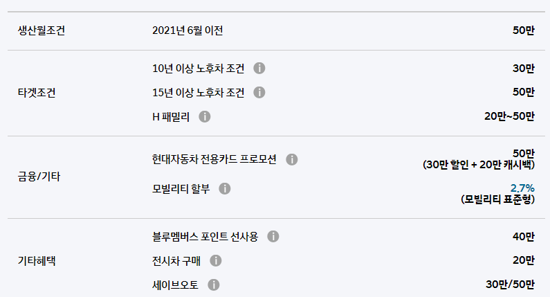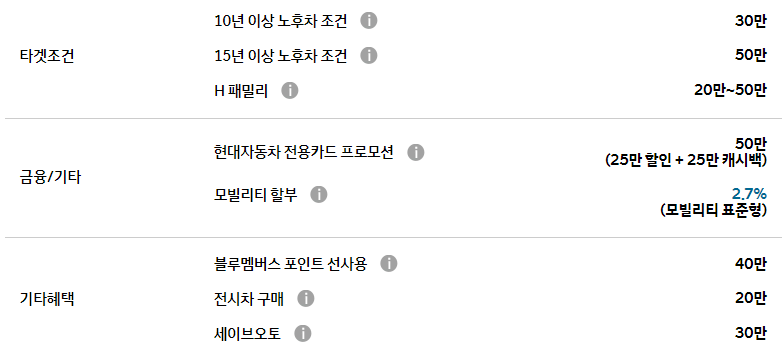 또한 현대차 재구매 고객들에게 20만 원부터 50만 원 까지 차등 혜택이 제공됩니다.